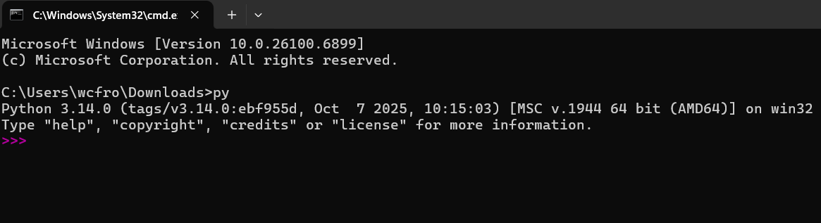 py and hit enter to open a Python console. If you see this screen, you are ready to code. Try typing something like print("hello") or 1 + 1.