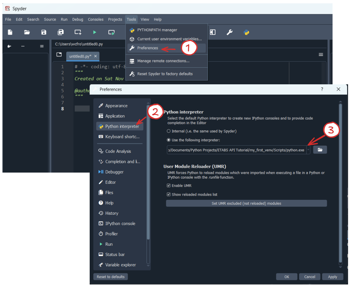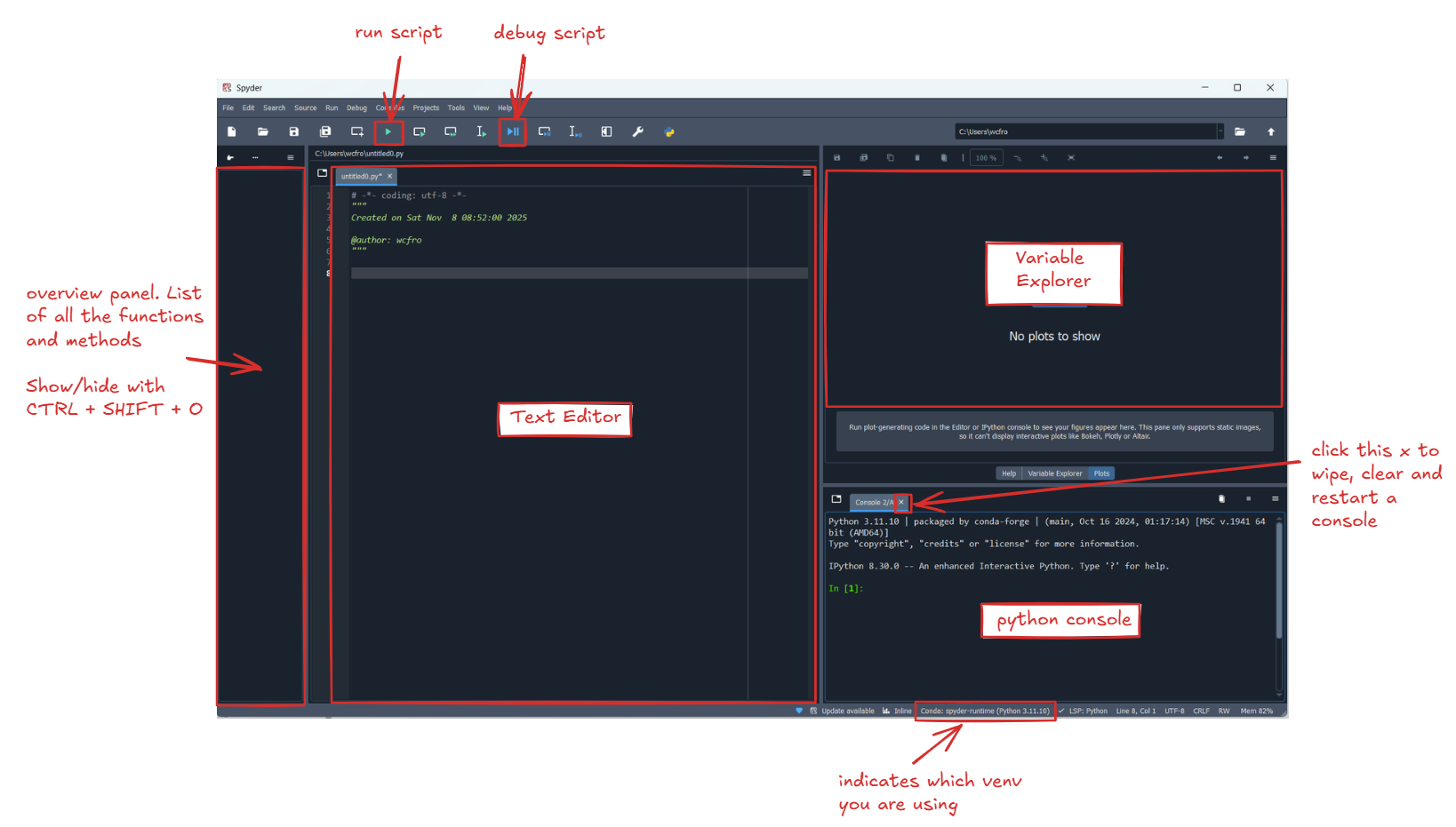 cmd in the windows explorer address bar.py -m venv my_first_venv. You can name it anything you like. Most people go with “venv” or “.venv”. This command will create a new folder in your project directory called “my_first_venv”. Inside, you will find a copy of python as well as any packages you might install later.my_first_venv\scripts\activate (note the left-leaning backslash “\” on Windows). Now you should see a (my_first_venv) prefix in your terminal.pip install numpy pandas comtypes matplotlib spyder-kernels.