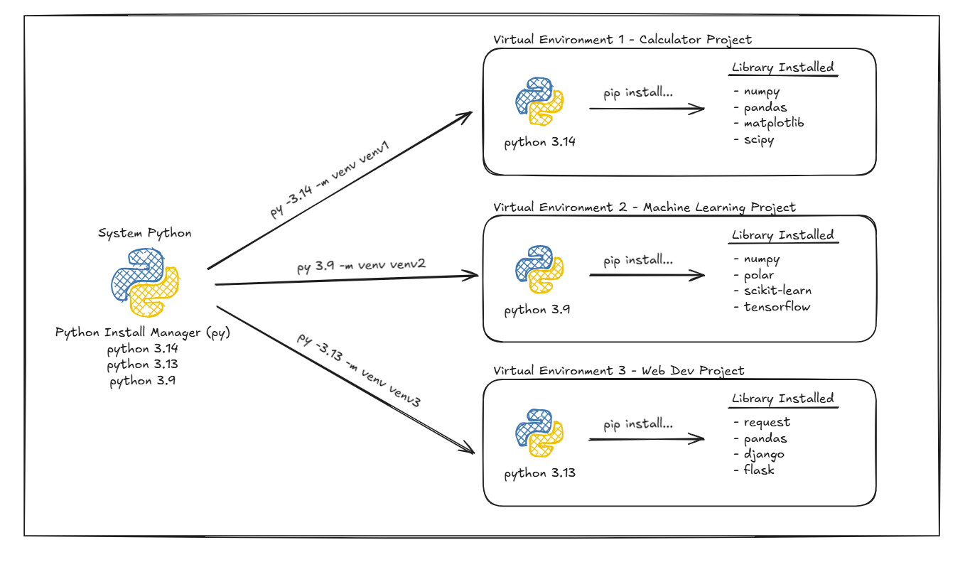 Anytime you start a new python project, the first thing you should do is to create a virtual environments (venv). Think of a venv as a sandboxed copy of python that lives in your project folder. Here’s an illustration of what I mean: